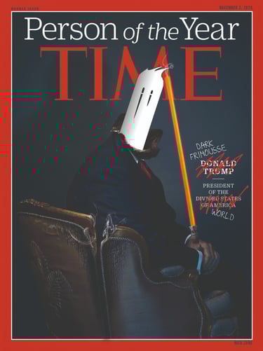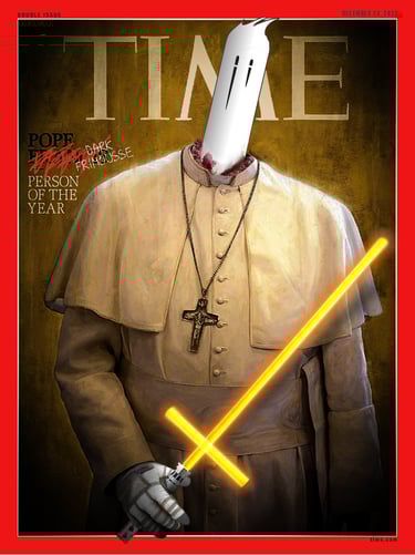 Dark Frimousse est une créature aussi énigmatique que dérangeante, née de la fusion improbable entre Dark Vador et Dirk Frimoutte. Mi-ombre, mi-icône, il erre à travers l’actualité, décapitant sans remords ceux qui dominent les Unes pour s’emparer de leur place. Masque figé et regard implacable, il incarne une satire grinçante d’une société obsédée par l’image, la célébrité et le pouvoir. Dark Frimousse n’est pas seulement un personnage ; c’est un miroir déformant qui reflète nos ambitions, nos dérives et notre soif d’immortalité médiatique.