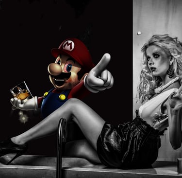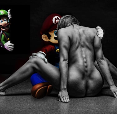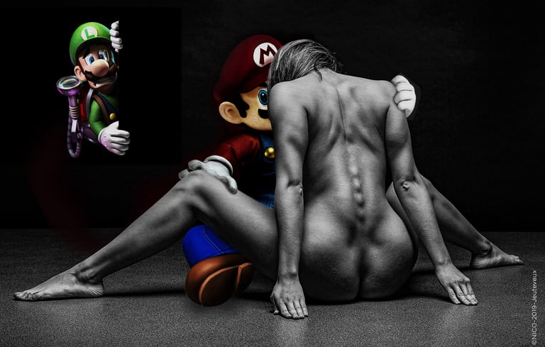 "Jeuxteveux" – Deux photomontages qui arrachent l’innocence de son cadre pour exposer la banalisation troublante de la violence et de la sexualisation de l’image féminine dans les jeux vidéo. Une critique visuelle percutante sur les dérives d’un imaginaire devenu norme.